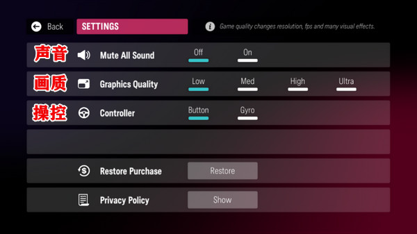 现在还没有中文设置,只有声音、画质、操作几个选项,手机好的可以把画质拉满