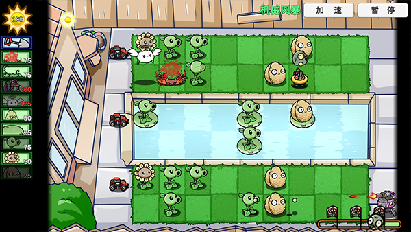 因有大量僵尸入侵,在这一关要快速种植一排坚果,以防止大量僵尸的入侵。能为攻击性的植物提供充足的时间对抗僵尸。
