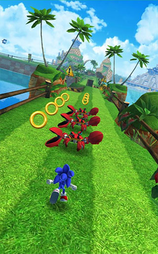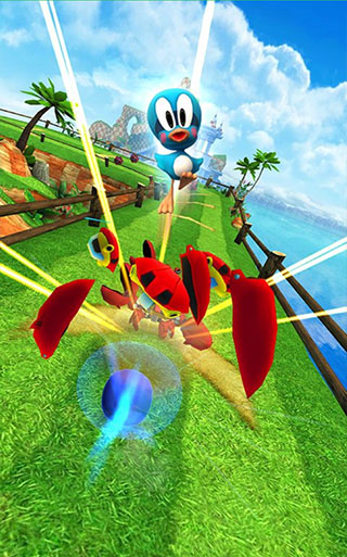 第一,无需等待一次操作完毕之后再进行第二次。这是什么意思呢?很简单,例如当你向上跳跃躲避障碍时,突然发现它后面竟藏着一只金螃蟹,此时需要果断地向下划动,立刻打断跳跃状态,索尼克会猛地砸向地面进入翻滚状态,效果看上会非常酷。