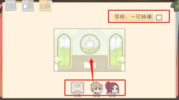 1、游戏内玩家需要将屏幕下方场景、人物拖入画板中,组成与关卡名称所符合的故事情节。