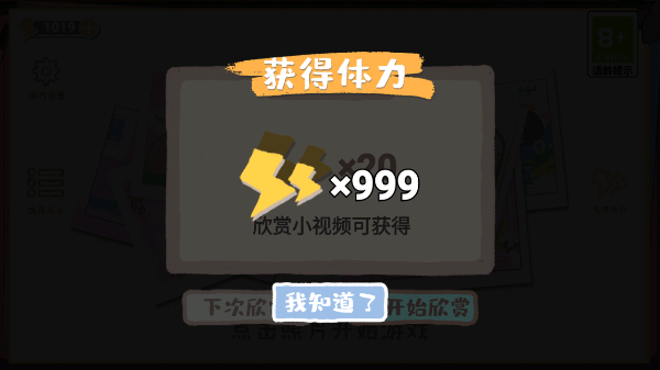 4、如果无体力可用,我们点击左侧体力加号,点击获取即可免费得到999体力,与免费解锁关卡相同,这也需要观看第三方广告。