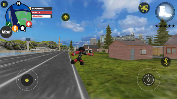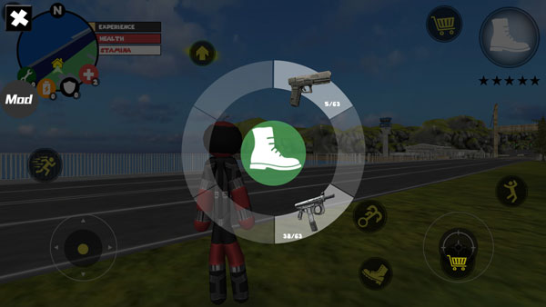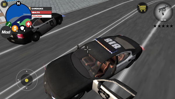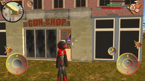 左侧移动、加速,右侧绳索,攻击(跳跃),跳跃,右上侧的武器更换以及血量、经验的显示都实时更新,一览无遗,凭借着大家自由的玩法,与其他帮派的人物进行交火,期间杀人能够获得经验,杀多了会产生星级,警察和其他附近角色会特殊照顾你对你展开火热的进攻,而如何存活,如何将其他人物击杀则是你所需要完成的任务。
