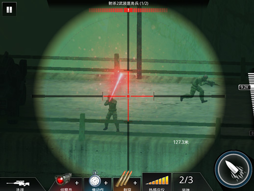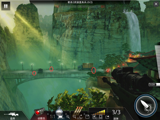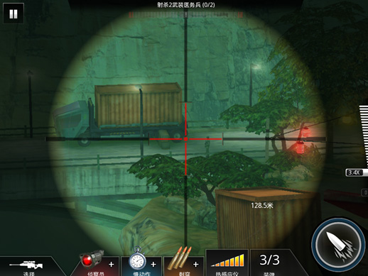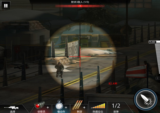没错,这也就说明了,该关卡除了有两个目标敌人外,还有另外一个敌人,那就是狙击手了(万恶的狙击手,这也是另该关卡难题提升的原因。那么,我们要怎么完成任务呢?