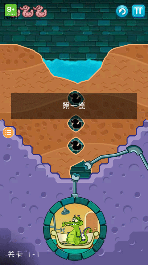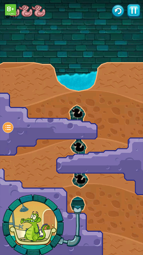 5、让水成功流到小鳄鱼位置,让小鳄鱼成功洗上一个舒服的澡即可通过关卡;