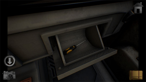 2、出门后注意到保险丝盒损坏,且位置过高无法触及。返回左侧路径走向海滩,登上船找到车钥匙,开启车灯照亮前方的小屋。