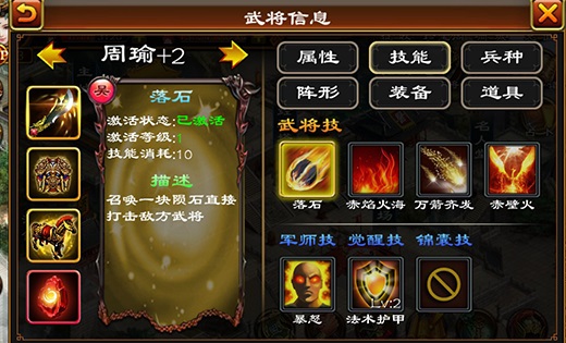 【落石:召唤陨石】 周瑜的第一个技能是单攻击落石,可以召唤一块陨石直接打击敌方武将!虽然只能攻击一个目标,但是周瑜攻击高,打起来还是很疼的!而且这个技能的冷却还是蛮短的,一次对战可以多次使用。
