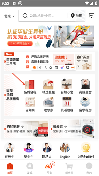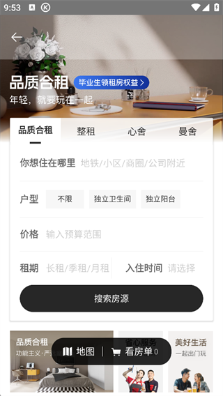 1、打开软件点击品质合租【如果你很有钱也可以点击精选整租】