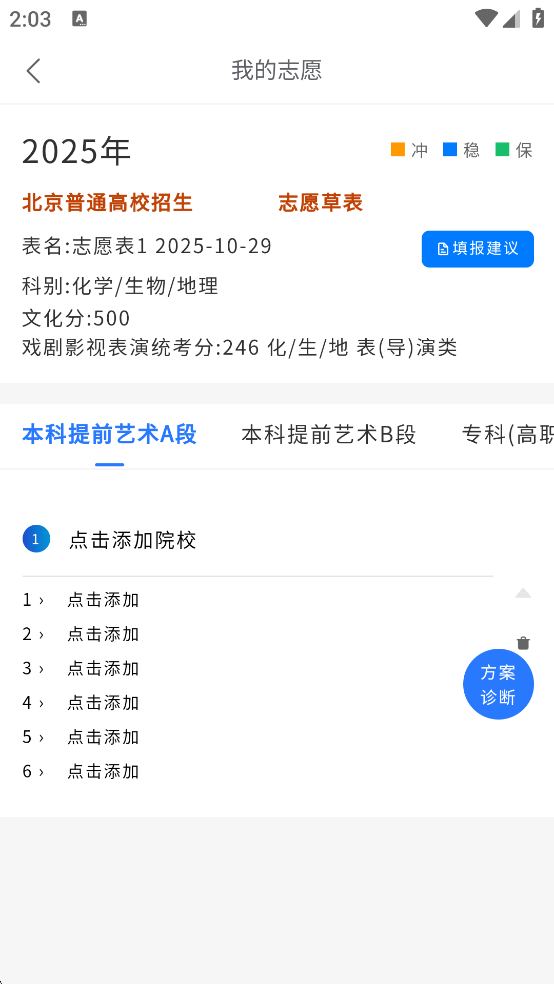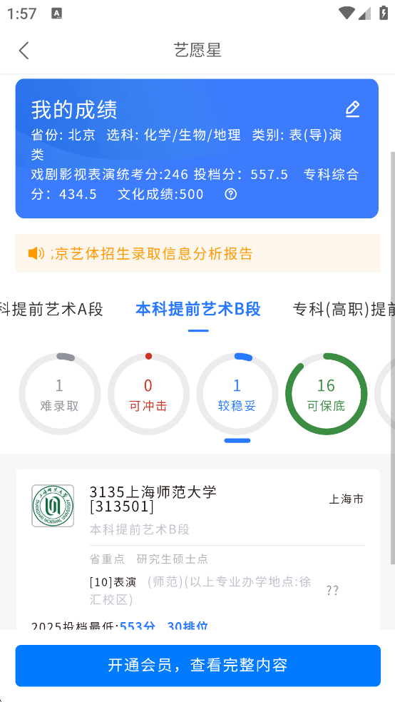 3、筛选:根据艺考成绩,一键筛选可冲刺、稳妥、保底的院校专业。